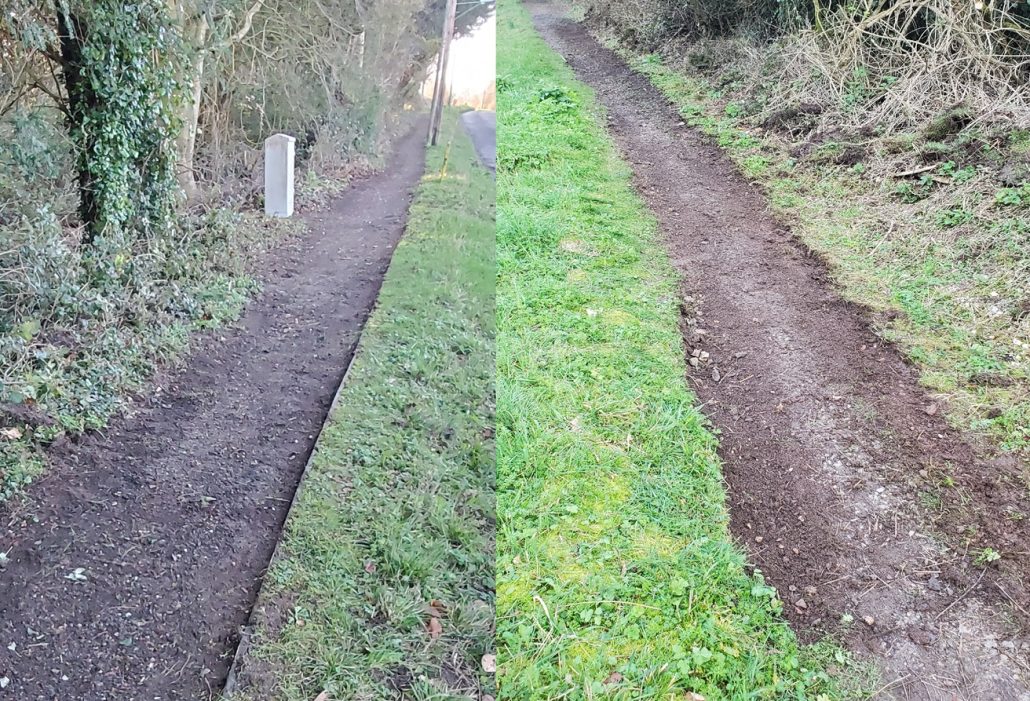 The Chairman of the Parish Council has cleared the footpath from 99 Firs Rd to the field gate, of overgrowing grass and soil along the edge of the path. The useable width of the path is now greatly increased, the surface has also been scraped back to the hardcore base to provide more grip and better drainage in wet weather.